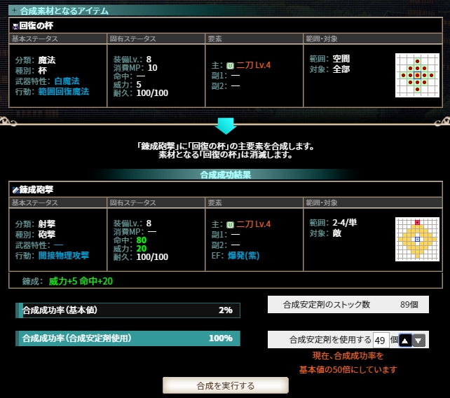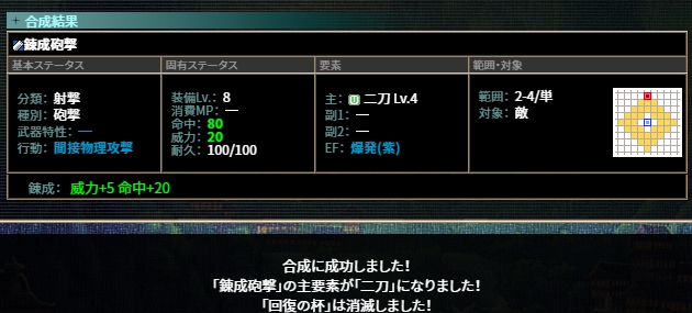 次は砲撃術Lv4を合成するか、上級砲撃の方の威力増加を上げるかだなー。